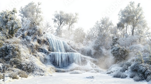Serene Winter Landscape with Frozen Waterfall and Snow-Covered Trees in a Tranquil Setting