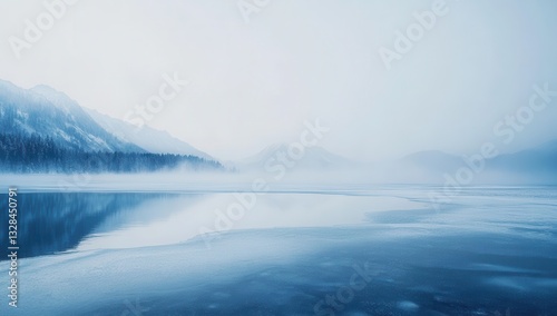 Serene Winter Landscape with Misty Mountains Reflected in Calm Waters at Dawn in a Tranquil and Isolated Natural Environment