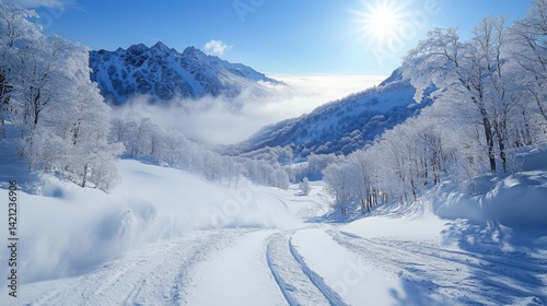 snow, winter, mountain, landscape, tree, sky, sunny, trail, white, cold, nature, scenic, season, frost, glacé, ice, sunlight, environment, pristine, peaceful, quiet, serene, beauty, fresh, calm, clear, ski, vacation, holiday, destination, adventure, tour tourism, recreation, exploration, panorama, vista, cloud, elevation, alpine, slope, winter sports, wilderness, calmness