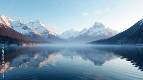 Serene Winter Mountain Lake Reflection: Misty Dawn, Snow-Capped Peaks, Tranquil Atmosphere