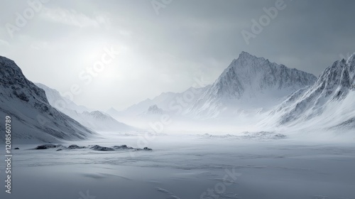 winter, mountain, landscape, snow, peak, serene, nature, overcast, cold, white, ice, glacé, wilderness, remote, view, scenic, tranquil, outdoors, environment, majestic, horizon, calm, atmospheric, beauty, elevation, frost, chill, huge, emptiness, weather, travel, exploration, isolation, arctic, adventure, slope, ridge, range, expanse, uninhabited, peace, silence, panorama, scenery, calmness