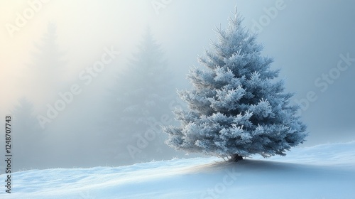 Serene Winter Scene with Snow-Covered Fir Tree in Soft Diffused Lighting on Pale Blue Background