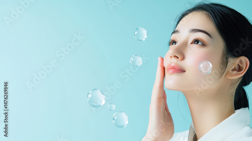 Serene woman gently touches her face, surrounded by bubbles against soft blue background, conveying sense of calm and beauty