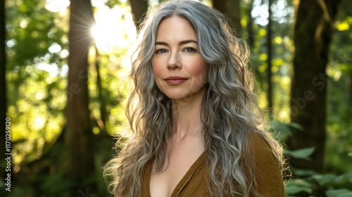 woman, portrait, forest, nature, hair, grey, long, curly, model, photo, beauty, natural, tree, sunlight, leaf, green, serene, calm, peaceful, tranquil, relaxed, confident, elegant, graceful, mature, style, fashion, lifestyle, feminine, summer, day, light, shot, background, colours, image, person, expression, look