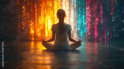 Serene woman meditating viewed from behind surrounded by vibrant abstract glowing lights representing positive energy harmony inner peace amidst chaos and balance in a mystical enchanting setting
