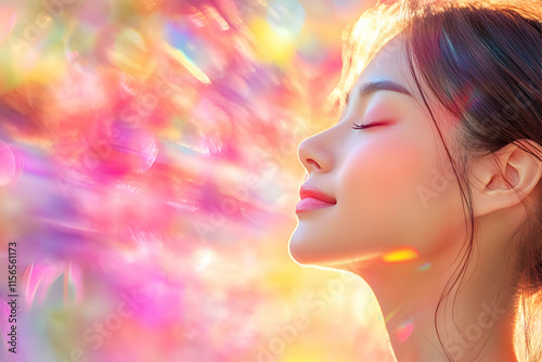woman, face, profile, beauty, skincare, wellness, radiant, glow, vibrant, colours, peaceful, moment, soft, light, happiness, inner peace, calm, calmness, spiritual, mindful, meditation, relaxation, serenity, healthy, skin, natural, bright, colourful, sun, aethereal, dreamy, feminine, delicate, graceful, elegant, pastel, hue, bokeh, texture, smooth, clear, complexion, youthful, pure, aura, energy, positive, optimism
