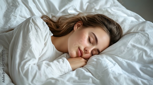 serene woman resting peacefully on white cotton sheets in comfortable bed showcasing sleep wellness relaxation and indoor nighttime calm environment
