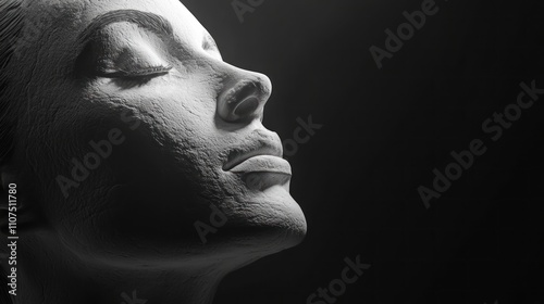face, woman, portrait, beauty, serene, calm, peaceful, skin, model, monochrome, black, white, closeup, elegant, feminine, tranquil, graceful, sensual, smooth, texture, light, shadow, contrast, art, aesthetic, style, expression, emotion, eye, nose, lip, cheek, head, neck, shoulder, profile, side, vertical, studio, photo, image, picture, graphic, design, visual, concept, abstract, minimalist