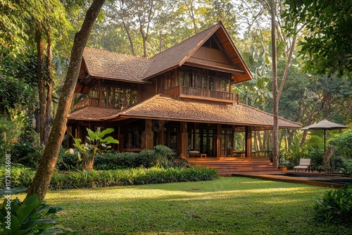 wooden, house, garden, greenery, afternoon, sunlight, rustic, architecture, peaceful, setting, living, nature, calmness, tree, filtering, cosy, vacation, home, lush, landscaping, relaxation, space, tropical, inviting, atmosphere, family, summer, natural, light, country, scenic, view, vibrant, colours, serene, environment, retreat, beautiful, landscape, residential, property, charming, design, furniture, shaded, area, generative, ai