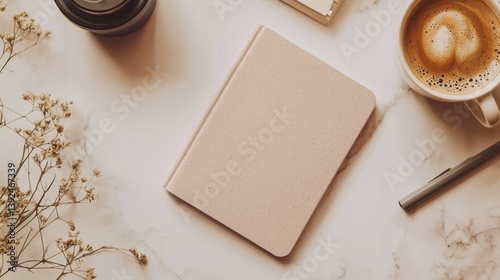 notebook, latte, marble, table, creative, profession, work, desk, office, flower, open, write, record, diary, journal, blank, beige, cappuccino, hot drink, white, pen, lens, camera, top, view, style, aesthetic, workplace, concept, stillness, design, light, space, clean, elegant, dry, neutral, calm, modern, minimal, simple, floral, artistic, cosy, warm, beverage, craft