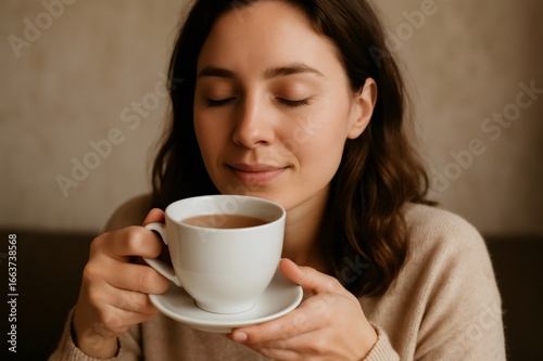Serene young woman savoring the comforting aroma of tea, eyes closed in bliss, embracing a moment of tranquility