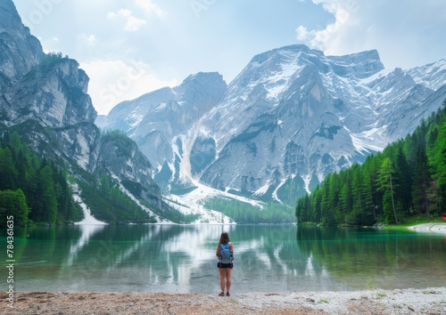 woman, standing, mountain, lake, nature, beauty, landscape, scenery, peak, calm, water, harmony, stillness, meditation, relaxation, adventure, exploration, wilderness, contemplation, mindfulness, escape, vacation, travel, get-away, horizon, view, blissful, dreamy, resort, leisure, rejuvenation