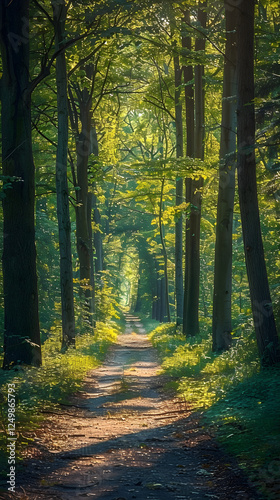 Serenity in Nature: A Tranquil Forest Path Illuminated by Dappled Sunlight, Inviting Exploration and Reflection