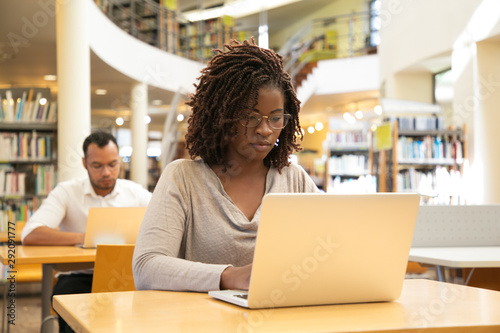 Serious African American student working on research paper in library. People sitting at desks and using laptops in computer class with bookshelves. Academic research concept