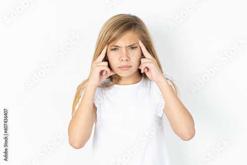 Serious concentrated beautiful caucasian teen girl wearing white T-shirt over white keeps fingers on temples, tries to ease tension, gather with thoughts and remember important information for exam