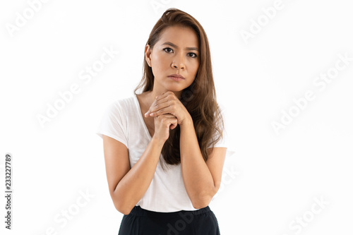 person, female, woman, girl, lady, latin, hispanic, adult, young, long, dark, hair, beautiful, t-shirt, shirt, casual attire, portrait, concept, studio, isolated, white, background, upset, unhappy, stressed, worried, concerned, serious, model, client, student, clasped, hand, praying, begging, asking, help, looking, camera, waiting, important, news, anxiety