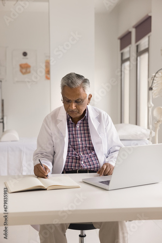 Serious focused older Indian practitioner man in white uniform coat writing medical notes, patients illness history in notebook, working at laptop computer, sitting at workplace table