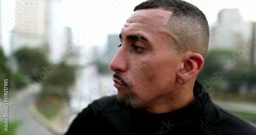 Serious hispanic man in downtown city. Pensive mixed race guy