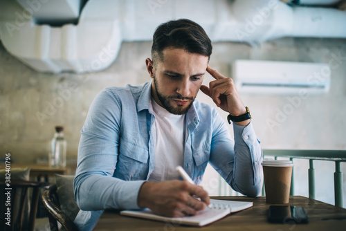 man, cafes, copybook, hot drink, sharpened, intelligent, smart, paperwork, condensed, pensive, planner, write, table, note, business, handwriting, professional, pen, thoughtful, serious, notepad, blue, shirt, casual attire, work, cafes, confident, thinks, to sit, young, cognition, workplace, wristwatch, cup, contraption, interior, modern, plan, cafeteria, entrepreneur, inspiration, occupation, information, intellect, notebook, guy, espresso, indoor, horizontal