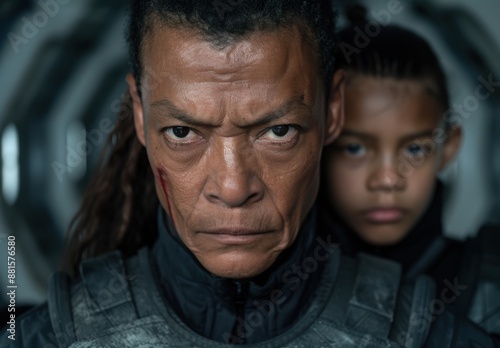Serious man with young boy in car