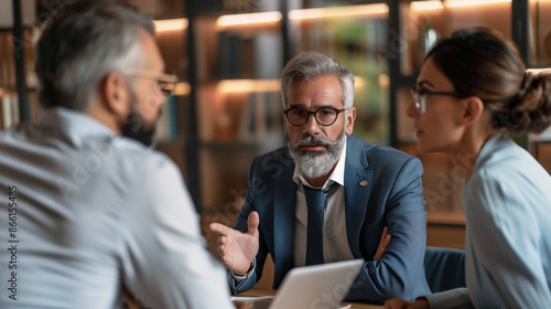 Serious mature businessman in eyeglasses looking at camera during meeting with colleagues in office