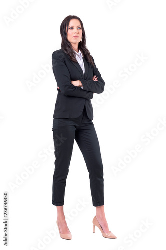 Serious skeptical business woman with crossed arms in elegant black suits looking away. Full body isolated on white background.