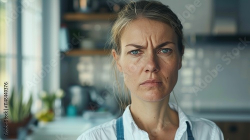 serious woman, kitchen, focused expression, home cooking, natural light, casual attire