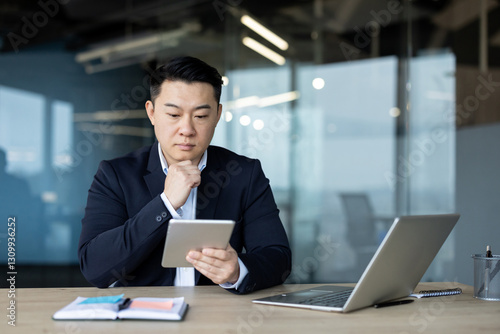 Serious young Asian male businessman in a business suit sits in the office at the table and looks thoughtfully at the tablet