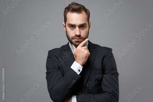 Serious young business man in classic black suit shirt tie posing isolated on grey background studio portrait. Achievement career wealth business concept. Mock up copy space. Put hand prop up on chin.
