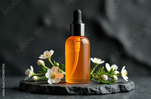 Serum or essential oil dropper bottle mockup, transparent orange glass, on dark grey natural textured background, small white flowers