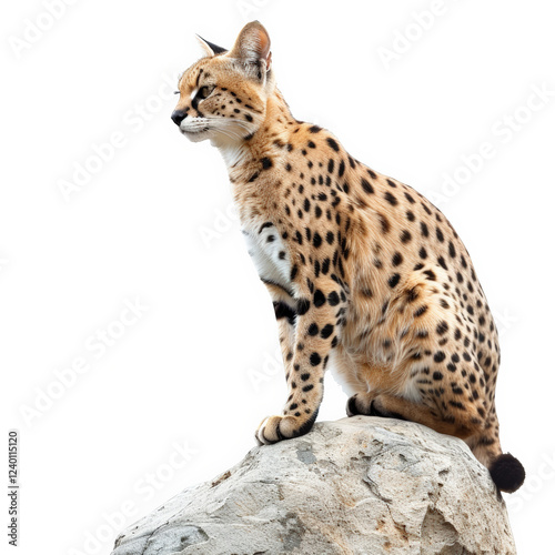 serval cat perched on rock, showcasing its elegant posture and unique spots
