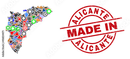 Service mosaic Alicante Province map and MADE IN distress stamp. Alicante Province map collage designed with spanners, gear wheels, instruments, items, vehicles, power strikes, details.