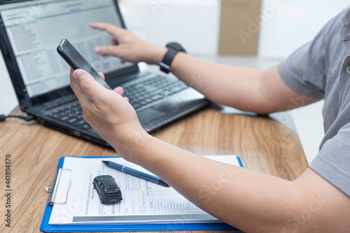 Service staff use smartphone Check details about car repairs compared to the data in laptop to estimate the cost of car repairs in office car service center