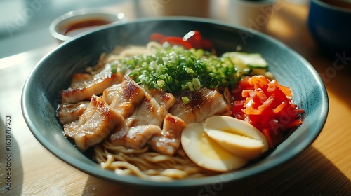 Serving Noodle Bowl with Sliced Pork and Vegetables on Table