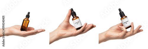 Set and collection of human hand holding amber glass dropper bottle with label, essential oil and natural serum skin care concept isolated on white transparent PNG background