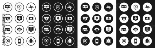 Set Barbed wire, Monitor with exclamation mark, Security camera, Folder password, Laptop, Shield, Lock monitor and Credit card icon. Vector