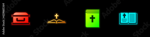 Set Coffin with cross, Holy bible book, and icon. Vector