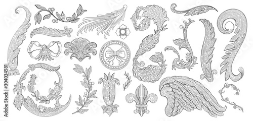 vintage, baroque, set, ornament, isolated, line, circuit, floral, victorian, heraldic, rococo, decoration, design, royals, monogram, retro, carved, filigree, elegant, antique, acanthus, arabesque, corner, collection