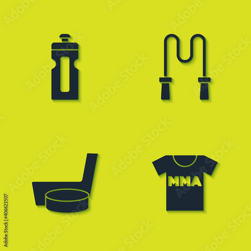 Set Fitness shaker, T-shirt with fight club MMA, Ice hockey stick and puck and Jump rope icon. Vector.