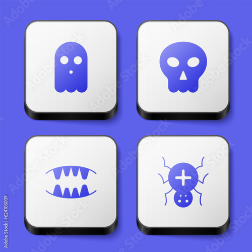 Set Ghost, Skull, Vampire teeth and Spider icon. White square button. Vector