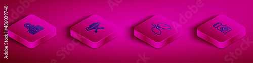 Set Isometric line Medical hospital building, Stretcher, Lungs and Medicine bottle and pills icon. Vector