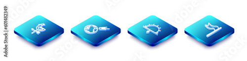 Set Isometric line Rooster weather vane, Comet falling down fast, Sunset and Meteorology windsock wind icon. Vector