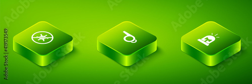 Set Isometric Whistle, Flasher siren and Protest icon. Vector.