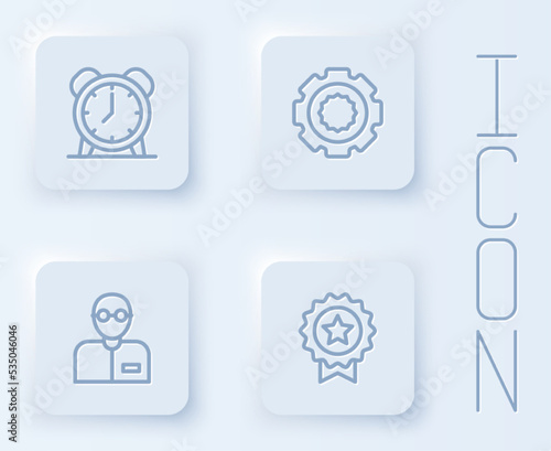 Set line Alarm clock, Gear, Teacher and Medal with star. White square button. Vector