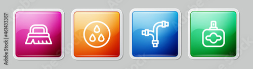 Set line Brush for cleaning, Water drop, Industry metallic pipe and Perfume. Colorful square button. Vector