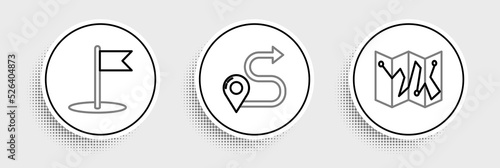 Set line Folded map with location marker, Flag and Route icon. Vector