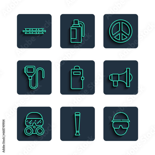 Set line Gas mask, Police rubber baton, Special forces soldier, Peace, assault shield, Walkie talkie, Barbed wire and Megaphone icon. Vector