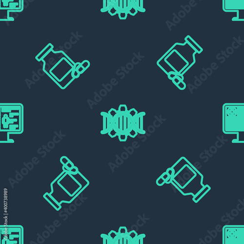 Set line Genetic engineering, Medicine bottle and pills and Clinical record on monitor on seamless pattern. Vector.