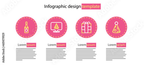 Set line Gift box, Party hat, Slice of pizza and Champagne bottle icon. Vector