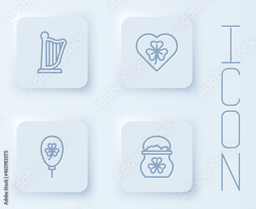 Set line Harp, Heart with clover trefoil leaf, Balloon and Pot of gold coins. White square button. Vector